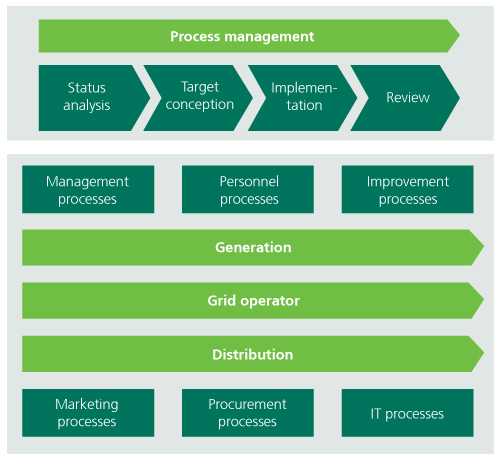 Growing cost pressure is forcing energy suppliers to reduce costs in the area of grids and distribution. In all parts of the value chain improvement through standardisation of business processes is the basis for minimising costs without a loss in quality in order to ensure the long-term competitiveness of the company.