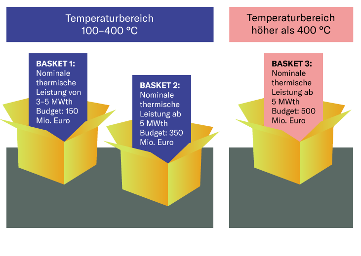 Bleiben in einzelnen Baskets Mittel ungenutzt, kann die Kommission diese zwischen den Themenbereichen umverteilen, um eine vollständige Mittelverwendung sicherzustellen. Mit der zusätzlichen Kategorie für mittelgroße Anlagen (3–5 MWth) wird die Relevanz der Auktion deutlich über Großindustrien hinaus erweitert. Damit erhalten nun auch mittelständische Unternehmen Zugang zur Förderung, die bislang aufgrund geringerer Produktionskapazitäten und Prozessgrößen von einer Teilnahme ausgeschlossen gewesen wären.