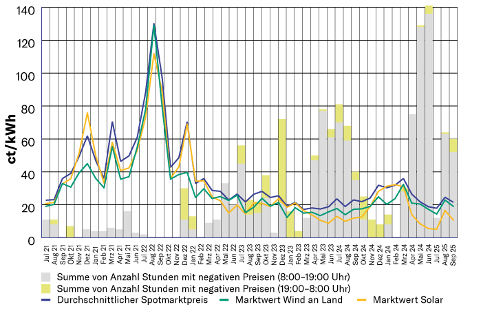 Die historischen Tiefstwerte des Marktwerts Solar sind unmittelbar auf ein Stromüberangebot zu bestimmten Tageszeiten zurückzuführen. In diesem Zusammenhang wurden im Mai und Juni 2025 neue Höchststände bei der Anzahl an Stunden mit negativen Strompreisen registriert: 129 bzw. 141 Stunden. Bis Ende September summiert sich die Zahl negativer Strompreisstunden im laufenden Jahr auf 525. Im Vergleichszeitraum des Vorjahres betrug die Anzahl 413 Stunden.8